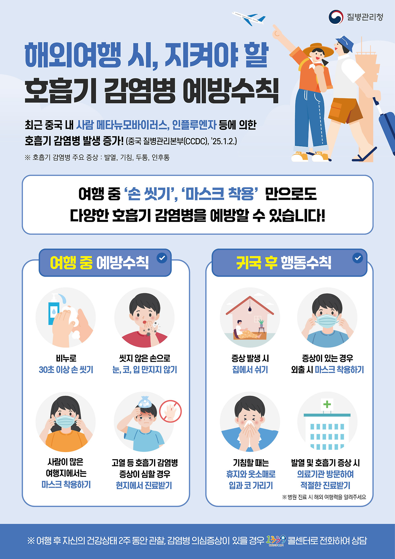 질병관리청에서도 연휴 기간 해외여행, 음식 섭취, 호흡기 감염병 예방수칙 준수를 지속적으로 당부하고 있습니다.