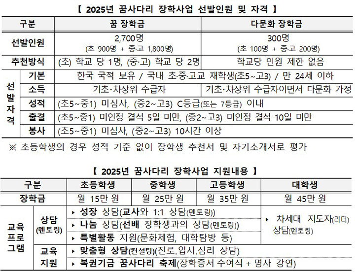 자녀를 키우다 보면 경제적인 문제로 인해 아이의 꿈이 꺾이지 않을까 걱정되는 순간들이 있습니다. 특히 재능은 있지만 가정 형편이 넉넉하지 않아 다양한 교육 기회를 누리기 힘든 아이들에게는 사회의 도움이 절실하죠. 이런 상황에서 ‘꿈사다리 장학금’은 아이들의 가능성을 지원하고, 미래를 향한 디딤돌이 되어주는 아주 뜻깊은 제도입니다.