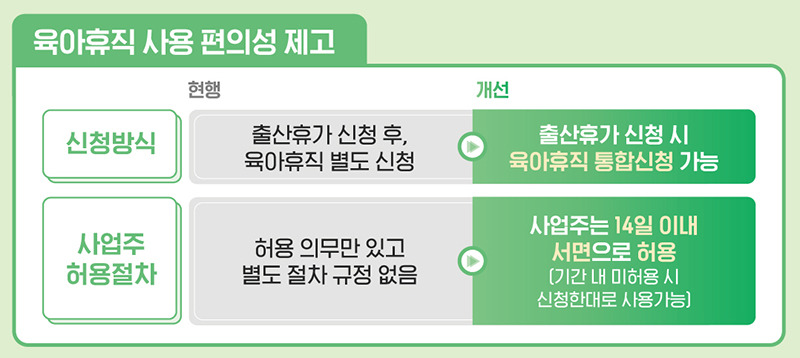 출산휴가, 육아기 근로시간 단축뿐만 아니라 육아휴직 활용 시에도 대체 인력 지원금을 지원하고 지원수준도 월 80만원에서 월 120만원으로 인상됐어요.