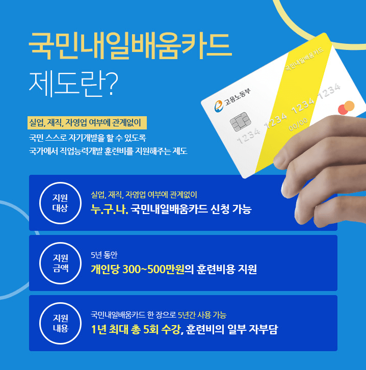 - 지원금액: 5년 동안 개인당 300만원의 기본 훈련비 지원 (소득수준, 고용형태 등에 따라 최대 100~200만원 추가지원 가능)