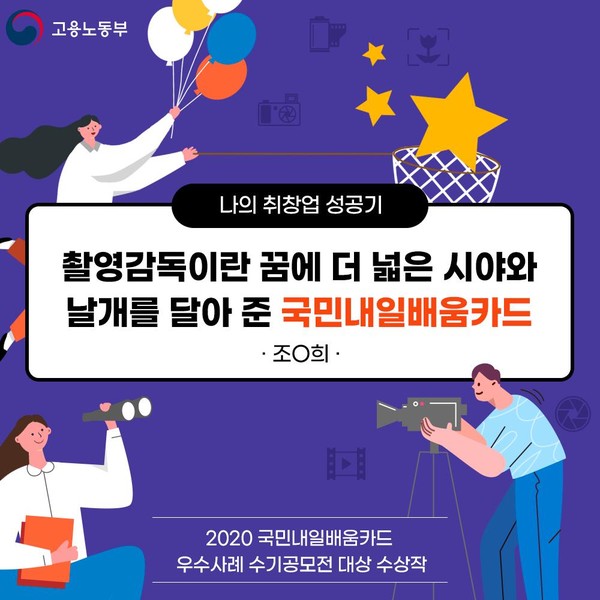 "영상편집에 관심이 있어 내일배움카드로 프리미어프로와 에프터이펙트 과정을 수강했습니다. 교육 과정 중에 만든 포트폴리오로 유튜브 크리에이터의 편집자로 일할 기회를 얻었어요. 비용 부담 없이 새로운 직업을 갖게 되어 정말 감사합니다." - 20대 이OO씨