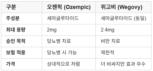 실제로는 같은 성분이지만, 위고비가 더 높은 용량까지 사용 가능해 체중 감량 효과가 더 큽니다.