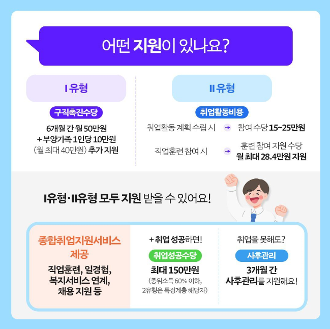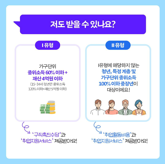 국민취업지원제도는 1유형(구직촉진수당 + 취업지원서비스), 2유형(취업지원서비스만 제공)으로 나뉘며, 대상 조건이 다릅니다.