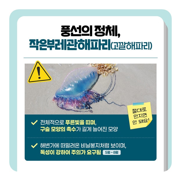 | 작은부레관해파리 | 5월 ~ 8월 | 투명 풍선처럼 생김. 강한 독성. |